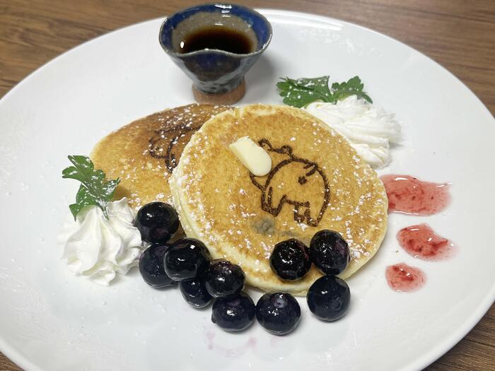 デザートにおすすめなのは、「ヤギの落とし物パンケーキ」です。こちらの落とし物は、ブルーベリーで表されています。何が落とし物なのかは...以下略です。パンケーキにもヤギミルクが使用されているそうで、ふんわり優しい香りが特徴です。