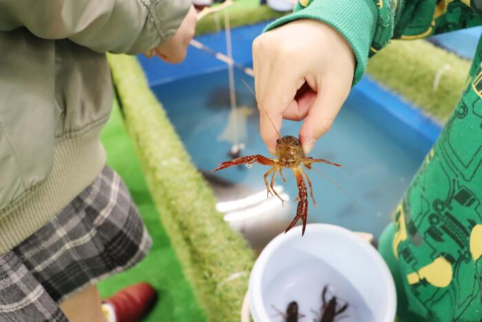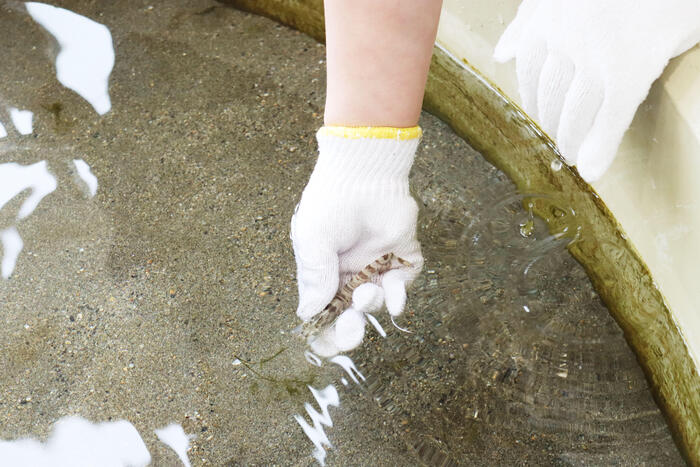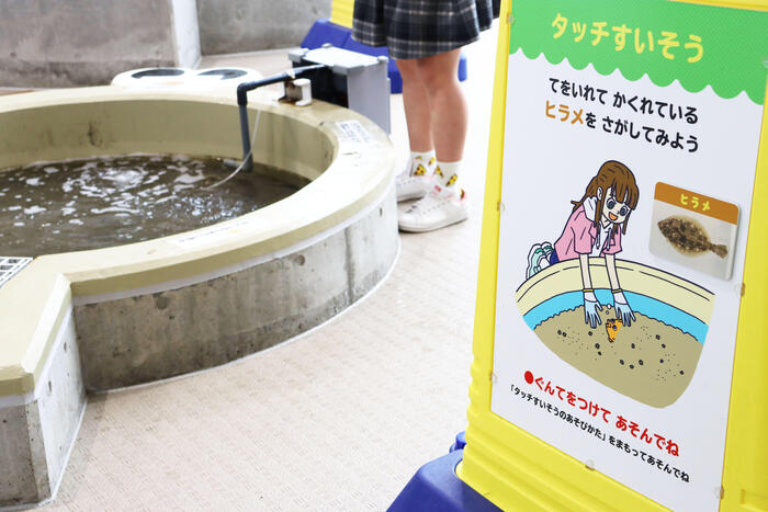 「タッチすいそう」では、トヤマエビとヒラメとふれあうことができます。