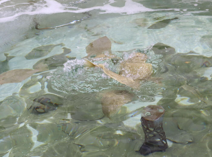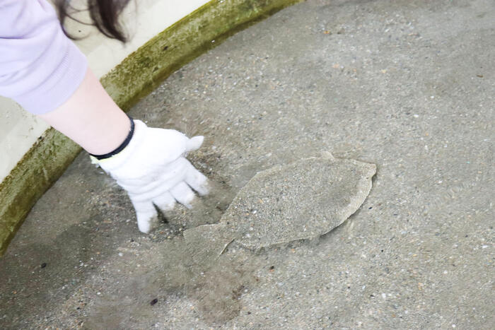 次にヒラメに餌をあげてみましょう。巨大水槽の中でじーっと重なりながら暮らすヒラメの皆さんの食事シーンなんて、想像もつきませんが、