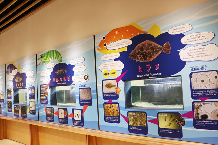 クロダイやヒラメの稚魚と直接ふれあえる「ふれあい館」。ガラス越しに稚魚の成長過程を観察できる「大型水槽」、魚のエサやりをゲームで体験できるコーナーや、生きた稚魚の展示、魚釣りゲーム、パズルなど、多数のコンテンツを楽しむことができる「交流館」などがあります。