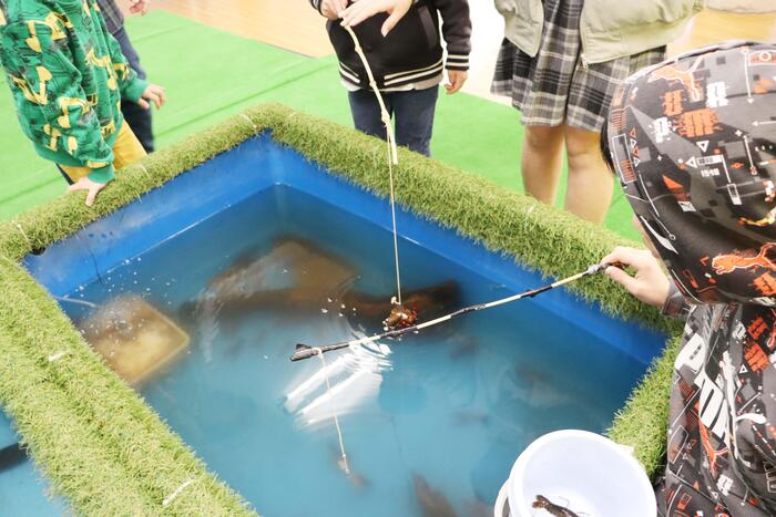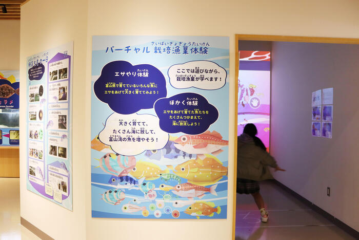 中でも注目なのが、「稚魚の餌やりゲーム」。大画面に映し出される稚魚たちに向かって、体を動かしながら正しいエサを選んで与える、体験型の育成ゲームです。