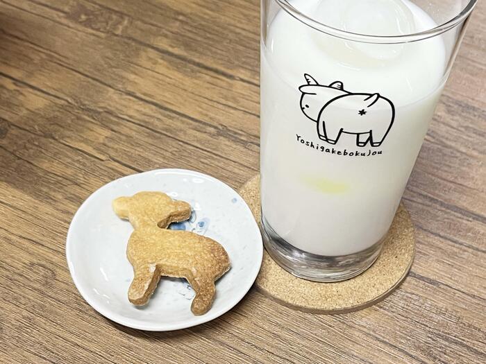 カフェメニューの一部をご紹介しましょう。げんじぃが飲んで育ったと言われるこちらはヤギミルク。ヤギのシルエットが可愛いクッキー付きです。消化しやすいので、牛乳でお腹がゴロゴロしてしまう人も、ヤギミルクなら大丈夫という場合もあるそうです。