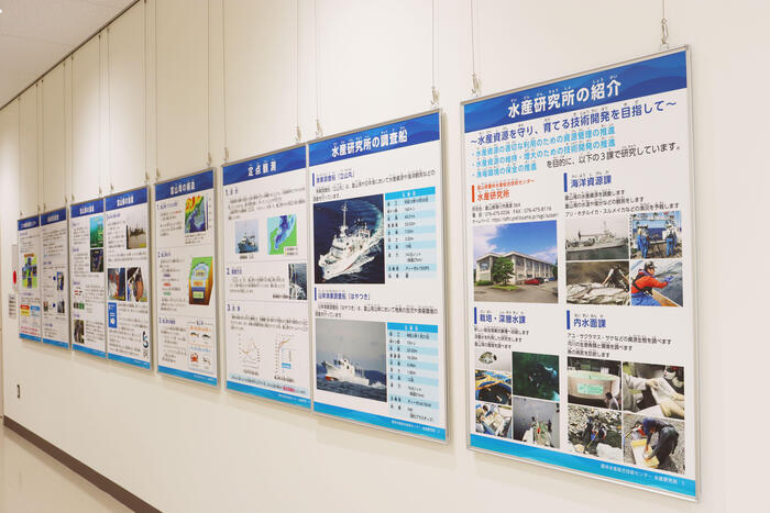 館内はパネル展示や、模型、実際の魚の展示で、水産研究所の紹介や、稚魚の紹介がされています。