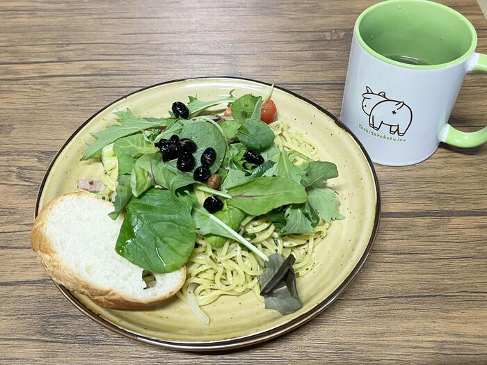 こちらは「ヤギの落とし物パスタ」です。ベビーリーフとバジルパスタを草原に見立てています。もちもちのパスタ、1切れ添えられたパン、見た目だけでなく、どれもが美味しい。そして、黒豆で表された「ヤギの落とし物」。これが何を表しているのかは、牧場に来ればすぐにわかります。リアルです(笑)