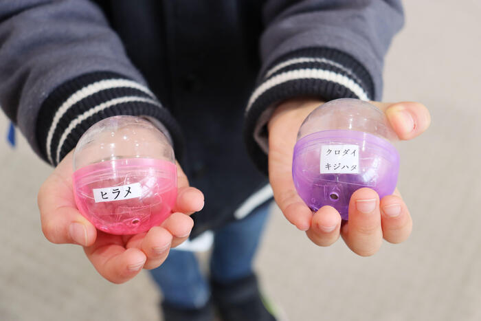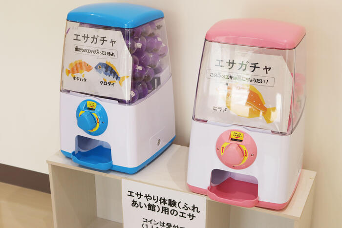 受付で職員の方からコインが1人1枚いただけます。そのコインを使って魚の餌と交換をこのカプセルトイでGETしましょう。キジハタとクロダイの餌、ヒラメの餌から選べます。餌やりは後ほど「ふれあい館」で餌やりができますよ。