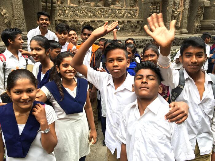 <TOP画像:世界遺産「エローラ」で出会った地元の学生たちと交流。ちょっとしたコツで、インドの旅はきっと忘れられない素敵なものに。>