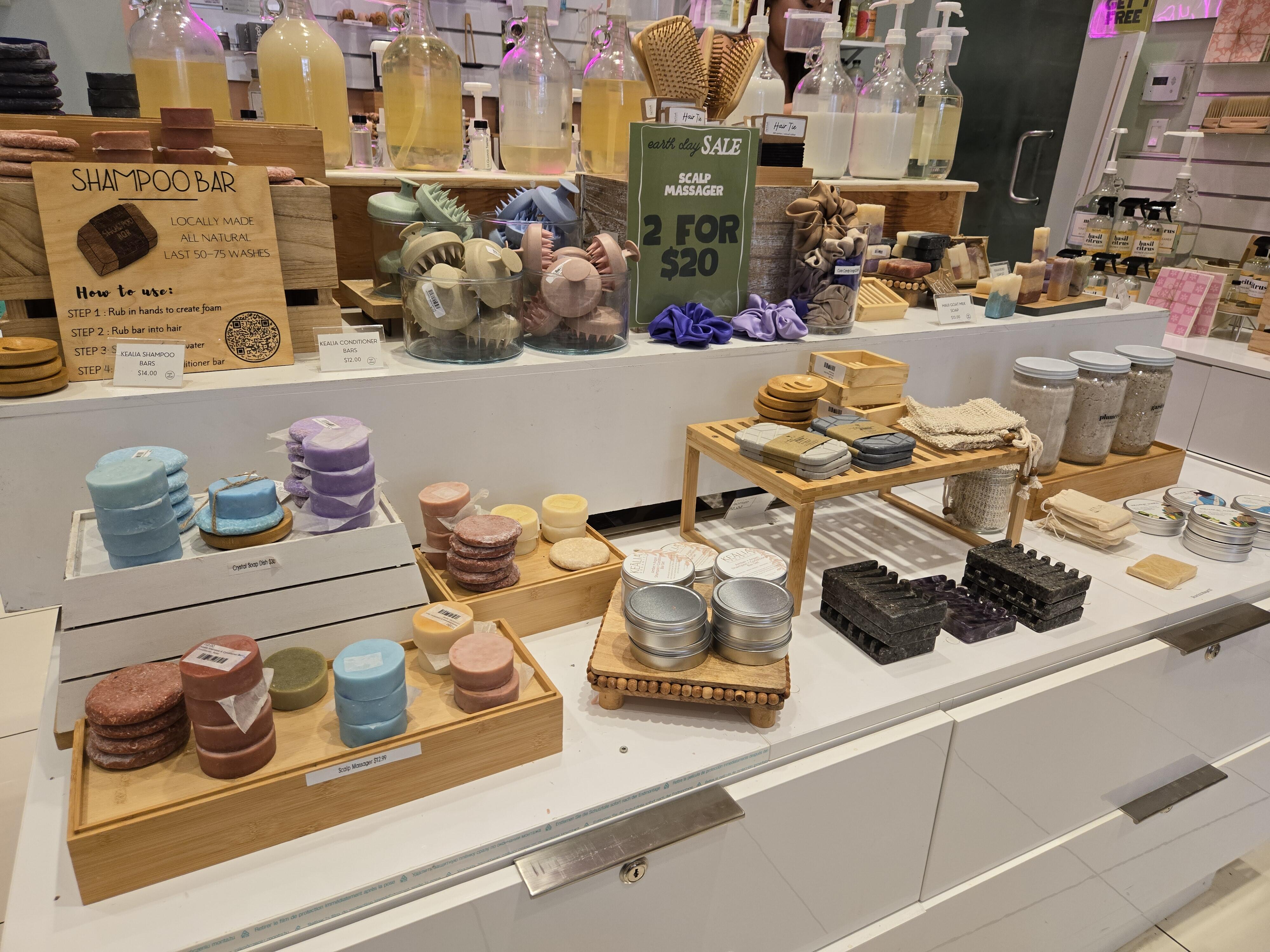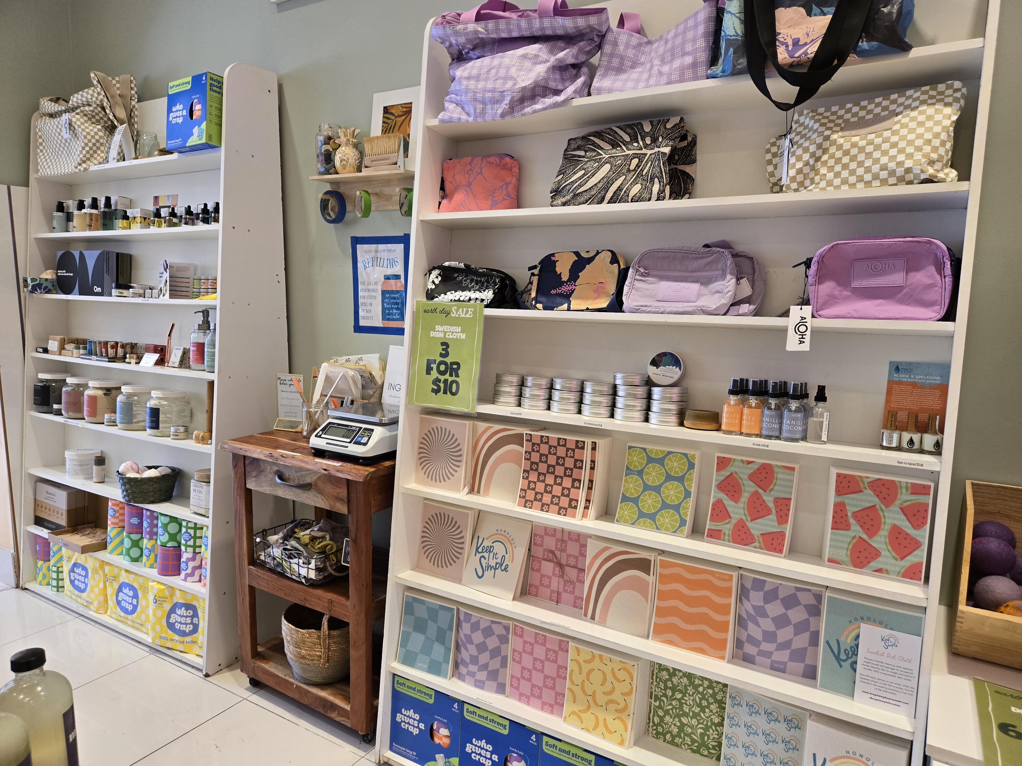 サステナビリティに特化した環境にやさしい商品を取り扱うこちらのお店には、量り売りの洗剤や、ローション、固形シャンプーなどの定番アイテムをはじめ、セレクトされた水着やTシャツ、サングラスなどのお洒落小物も揃っています。