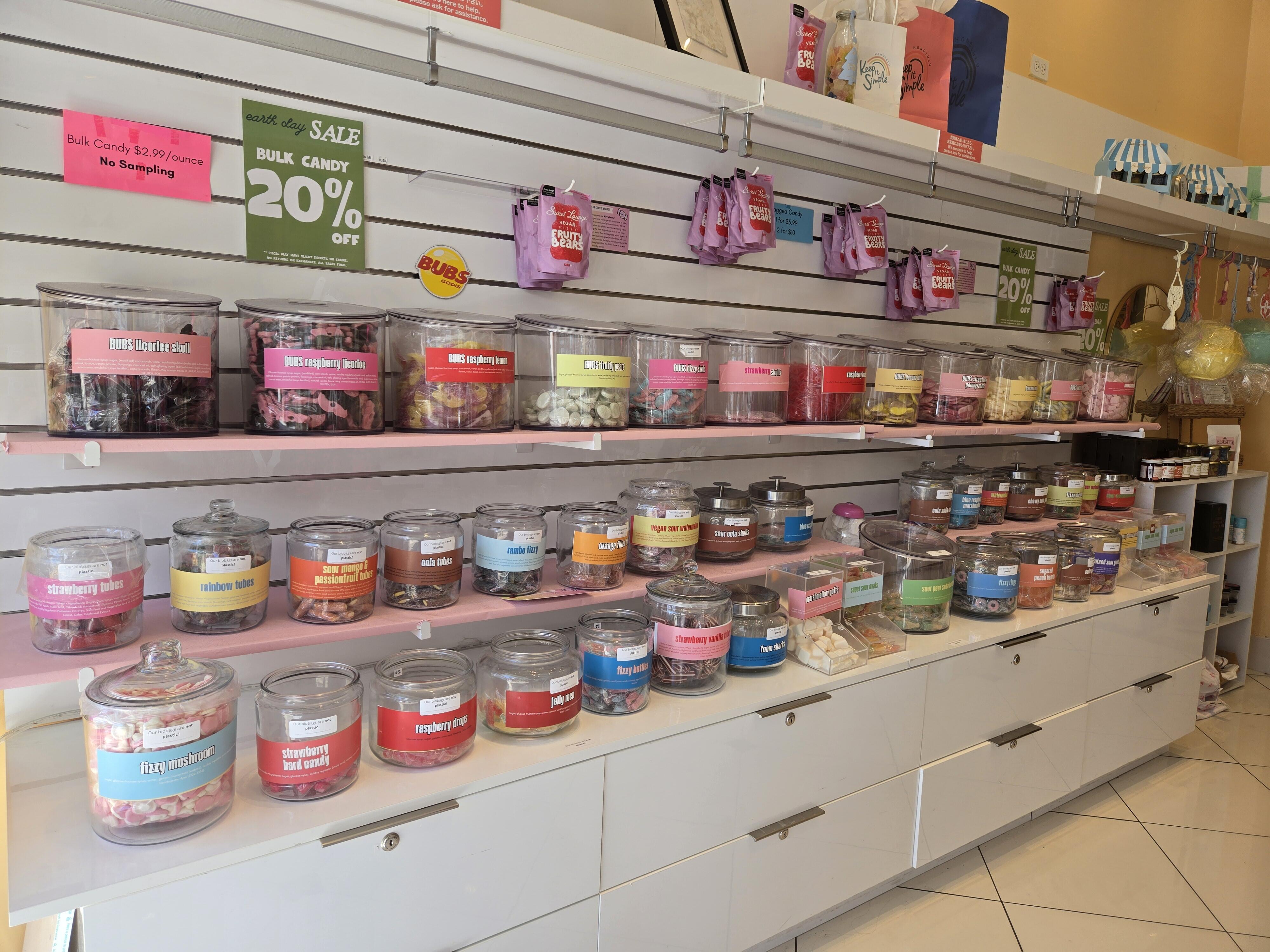 同じく量り売りのお菓子のセクションは、好きなキャンディなどを袋に入れて秤に乗せたら、表示された重さを自分で記入したシールを貼ってお会計するシステム。お店の内装も可愛くて、ローカル女子にとても人気のお店です。