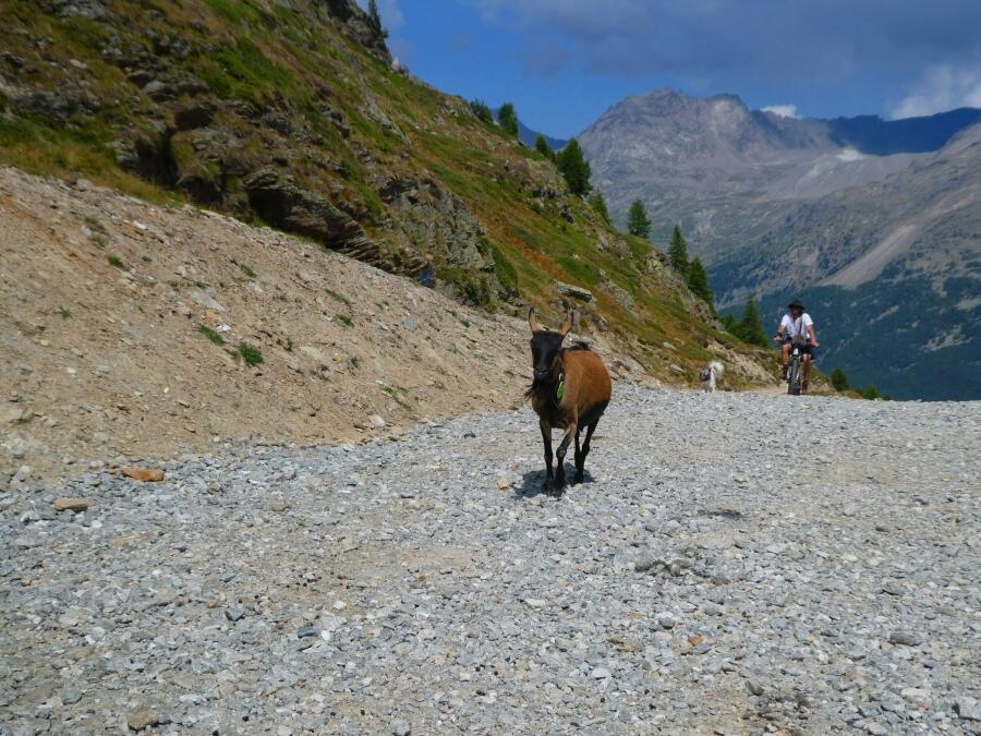こうしてヤギと交流していると、まもなく自転車に乗ったヤギ飼いの青年が、牧畜犬と共にやってきて、ヤギたちを追い立て、あっという間に去っていきました。