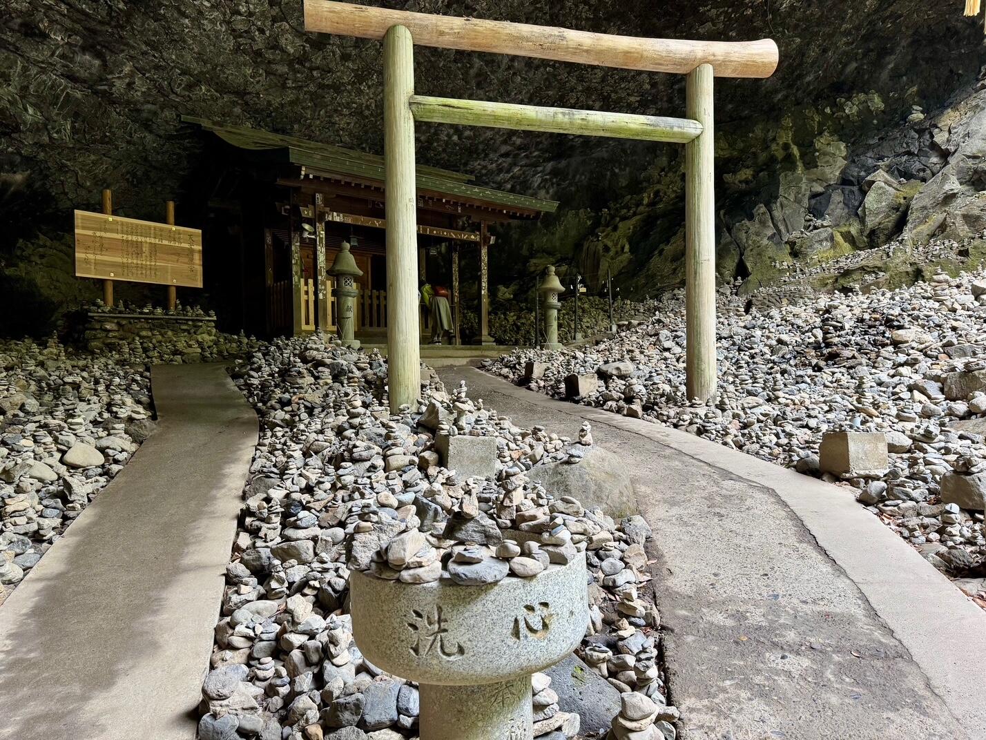 天照大神が岩戸にお隠れになった時に天地暗黒となり八百万の神がこの河原に集まり神議されたと伝えられる大洞窟です。