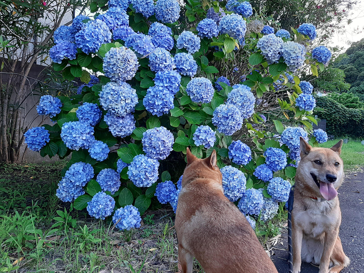 急に開けた「西岬地区公民館」の敷地に出ました。敷地内のアジサイがきれいだったので、あわとアスマの記念写真をパチリ。