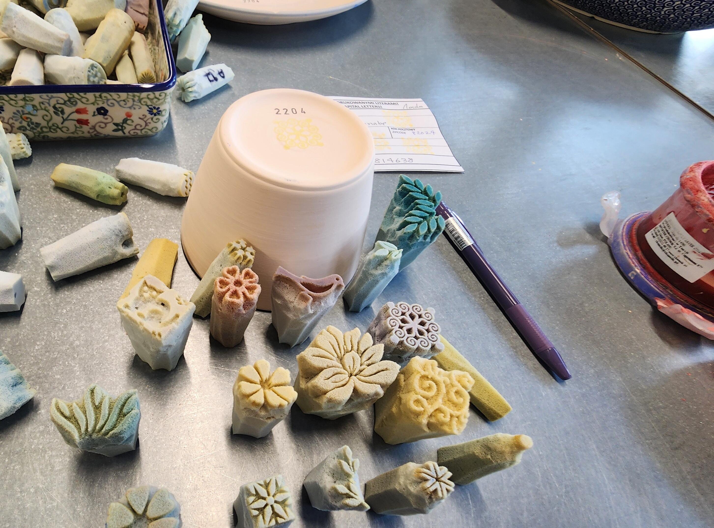 最初に絵付けをしたいお皿かボウルを選びます。ショップに並んでいる完成品を見て、デザインや色合わせのアイデアを参考にしました。窯で焼くと絵の具の色は変わるそうで、完成時の色チャートを参考にしながら絵の具を選んでいきます。