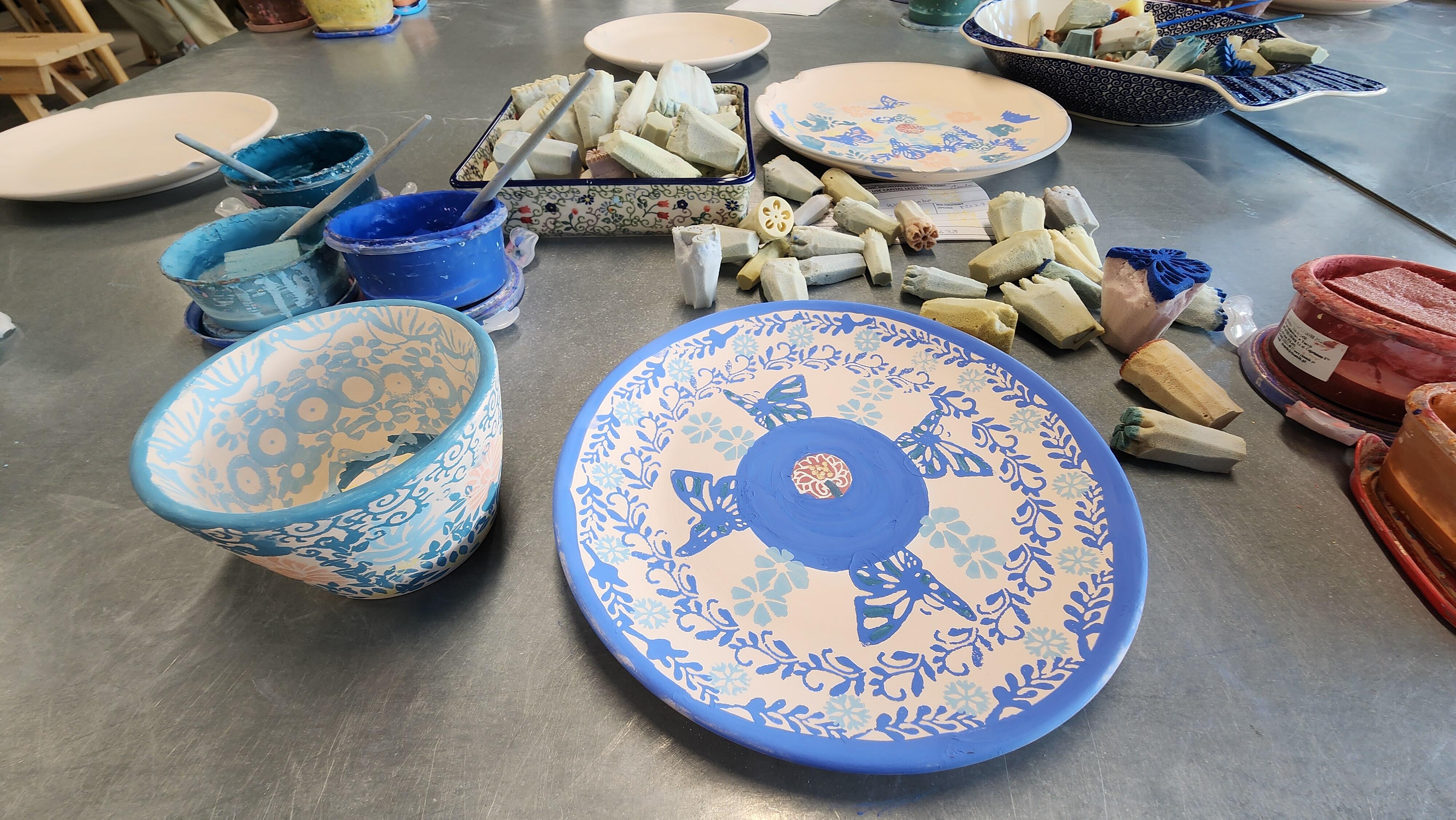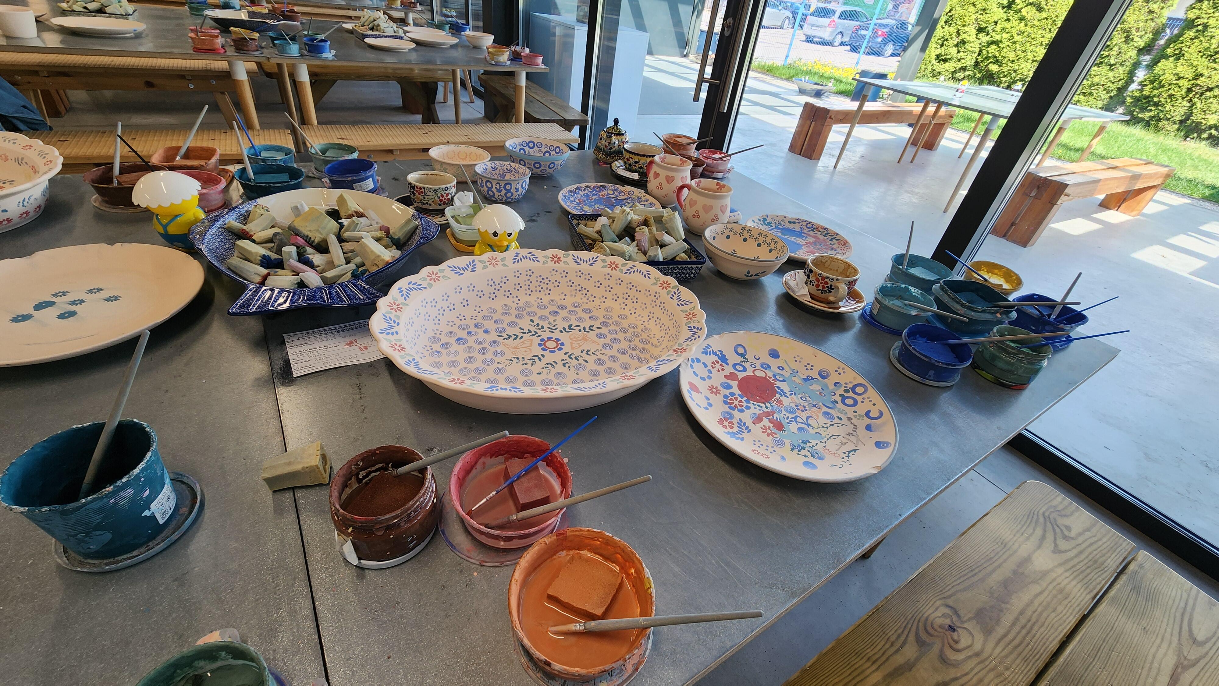 家族連れも参加していました。筆を使って絵を描き足し、世界に一つだけのマイプレートが完成です!陶器工場に預けて窯で焼いてもらいます。
