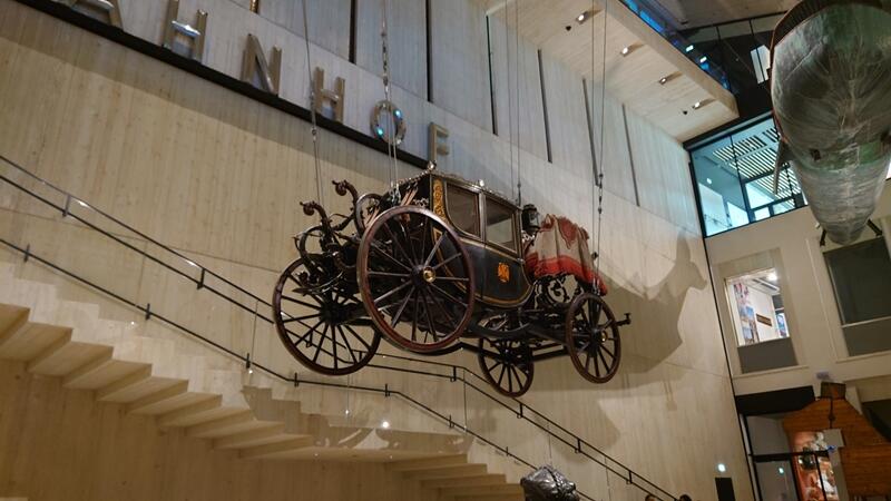 2階に上がると、大きな吹き抜けがあります。この展示室には、19世紀にウィーン市長が乗っていた豪華馬車や、プラーター公園にあったレストラン「クジラ亭」の装飾など、目をひく展示物が宙に浮いています。