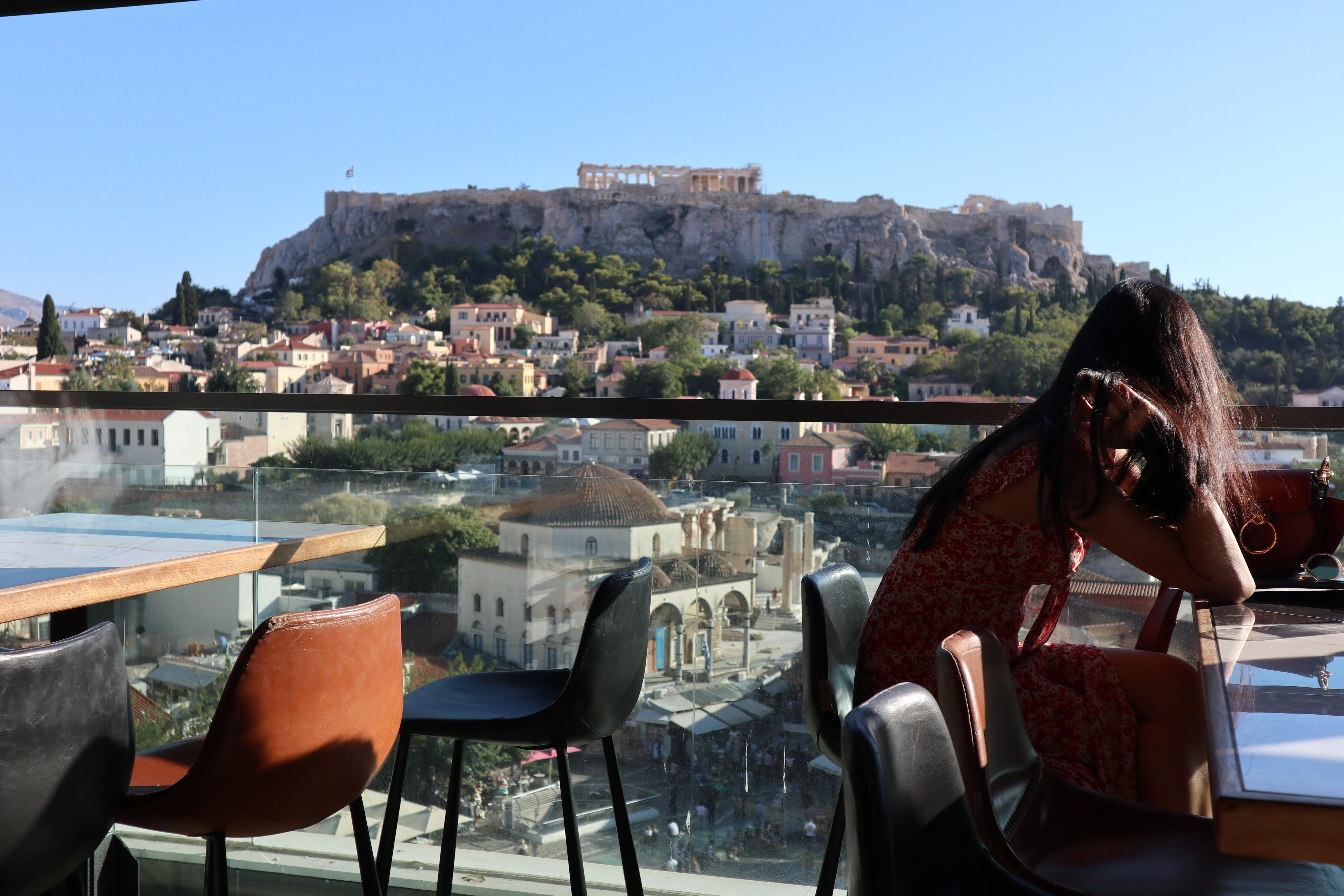 モナスティラキ駅前ホテル屋上のルーフトップバー、食事メニューは少ない。アクロポリスの夜景が素晴らしいので食事の後にカクテルでもいかが?