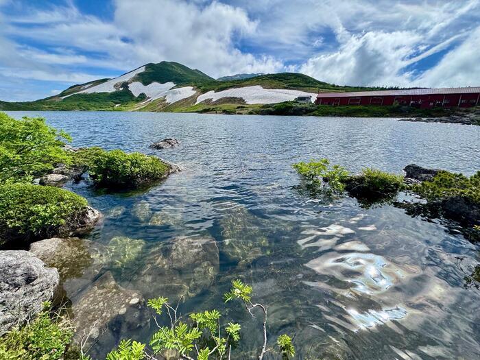 白馬大池に面して建つ白馬大池山荘は赤い外観の平屋建て。横に長い建物です。予約制です。
