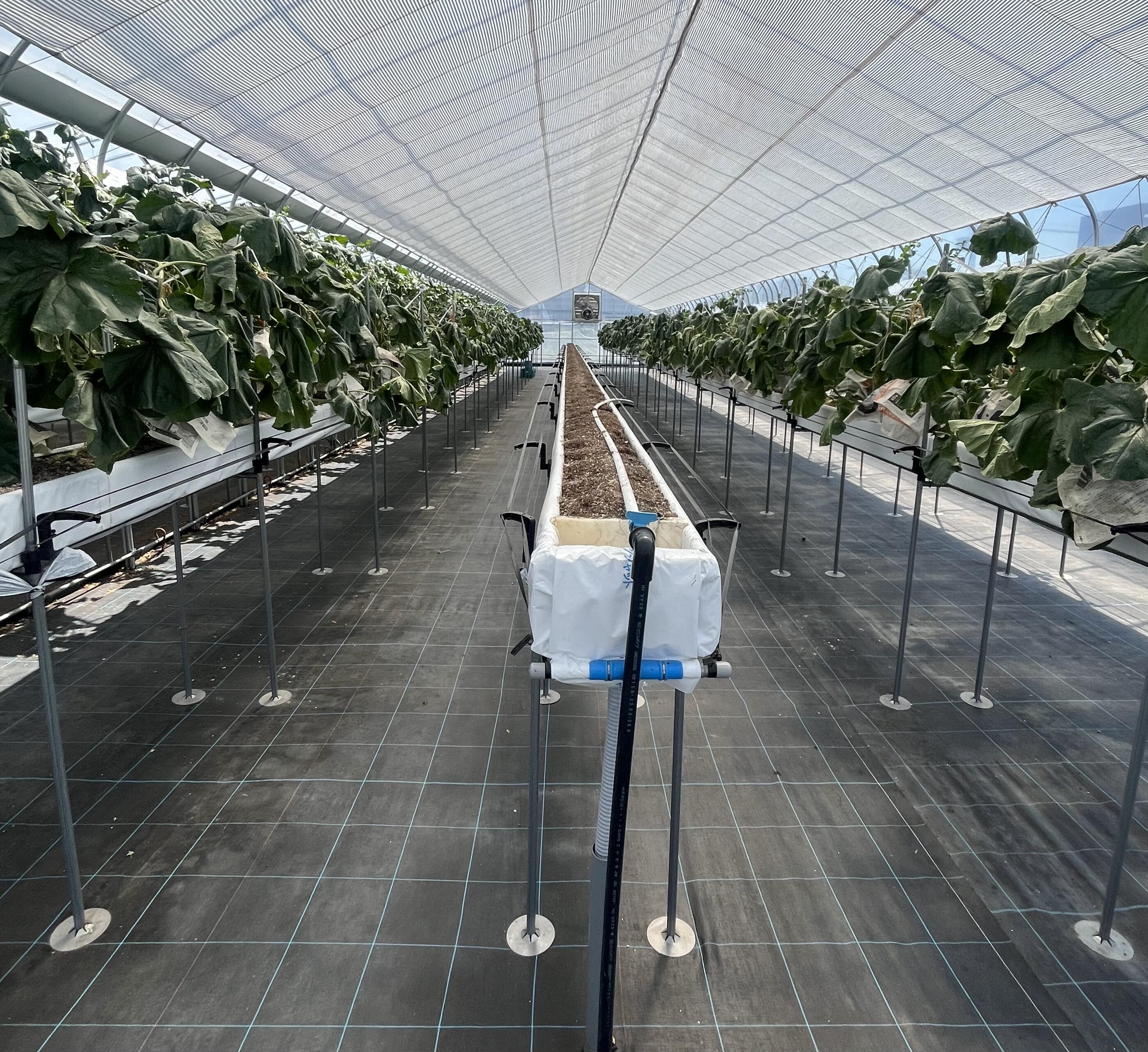 最初に向かった「Ichigo Lab Izumisano」はイチゴを栽培し、イチゴの観光農園も行っています。端境期には、空いたイチゴの高設栽培ベンチにメロンを植えるというユニークな方法を取っていました。