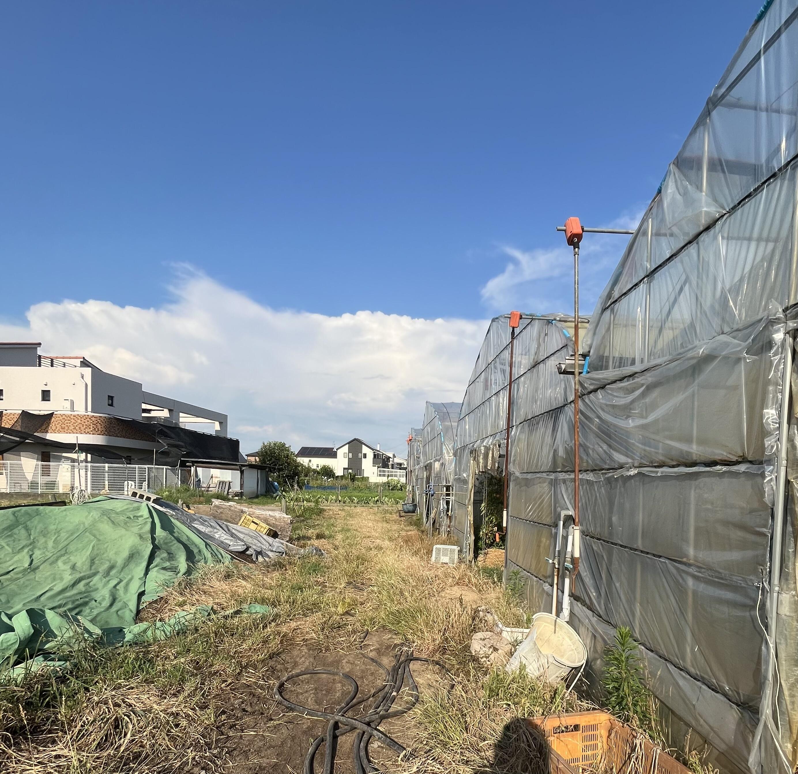 <ハウスや畑に隣接して住宅地があります。でも、美味しい野菜を求めて近隣の方々は同農園の直売所に足を運びます>
