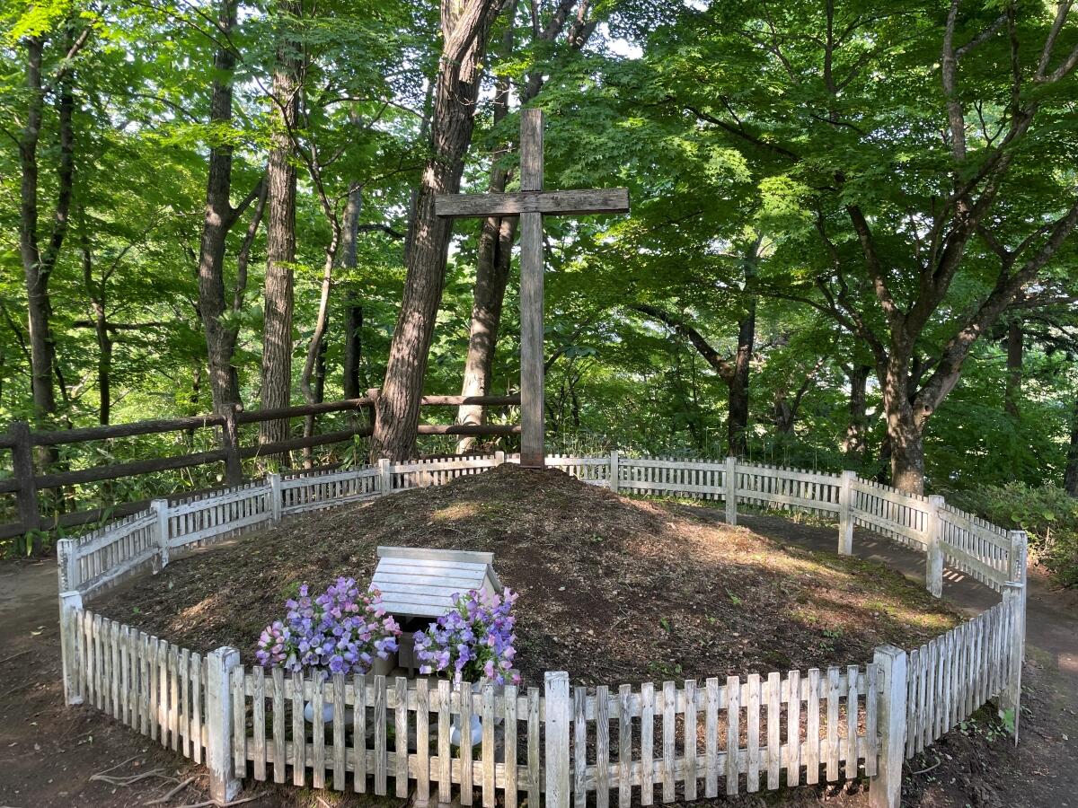 ということで階段を上がりますといよいよキリストの墓と、その向かい側にはイスキリの墓にもご対面です。木製の大きな十字架が目を引くキリストの墓は静かな中で緑に囲まれています。十来塚という表記もありますね。