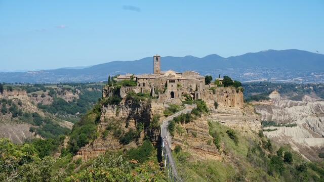 崖の上にぽつんと浮かぶように見える姿から「天空の城」とも呼ばれ、ジブリ映画「天空の城ラピュタ」の舞台を思わせる絶景スポットです。一番の絶景スポットは城壁内に入る前、駐車場側からチヴィタ・ディ・バニョレージョ全体を見渡せる場所なので、歩く前に写真撮影は忘れずに!