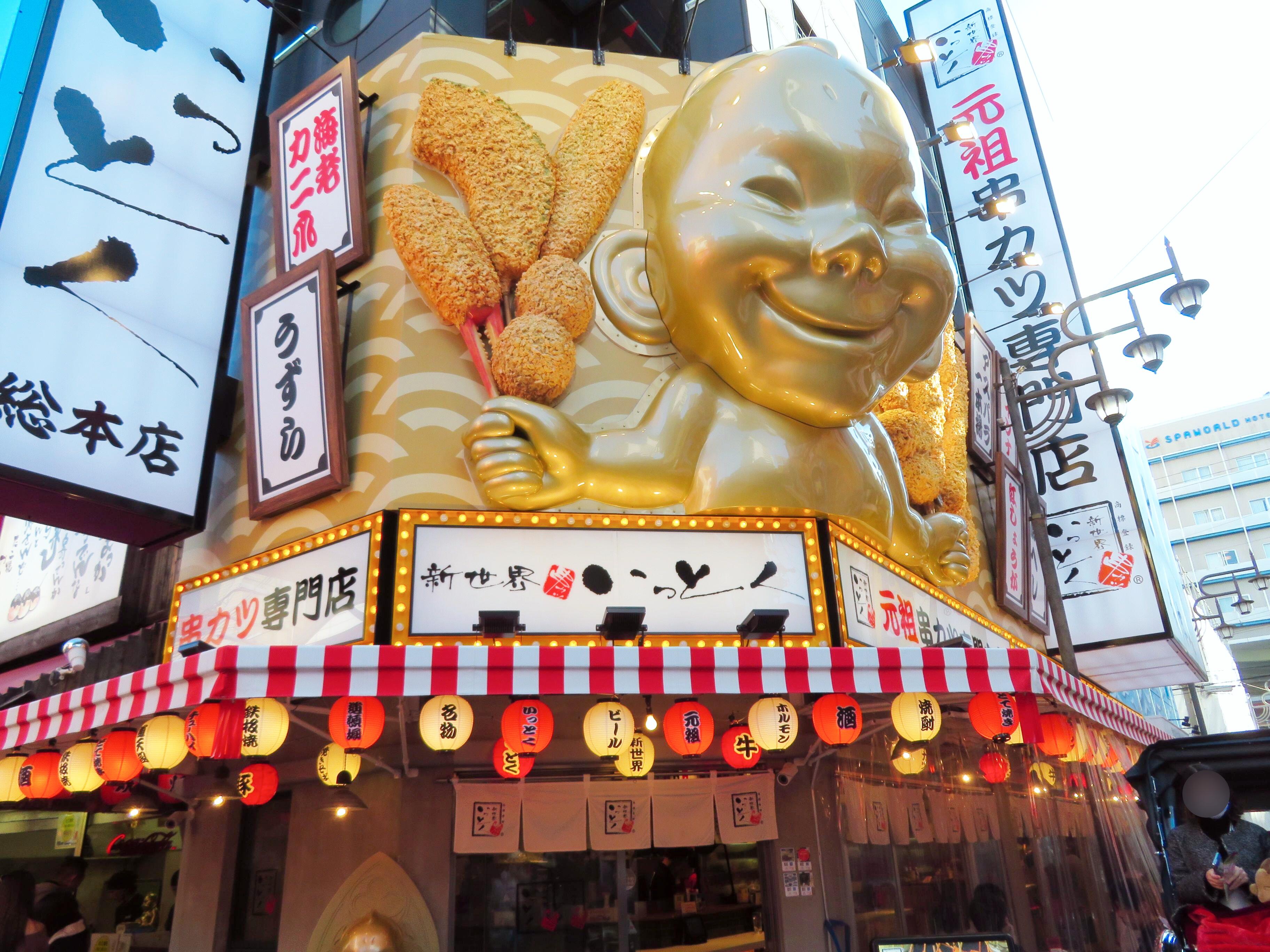 笑顔のビリケンさんと通りを隔てて向かい合うのは、串カツを持ったビリケンさんです。「新世界串カツ いっとく 総本店」は、通天閣の南下で「横綱 新世界本館」と人気を二分しています。海老、カニ爪、うずらの串カツには、食欲がそそられることでしょう。