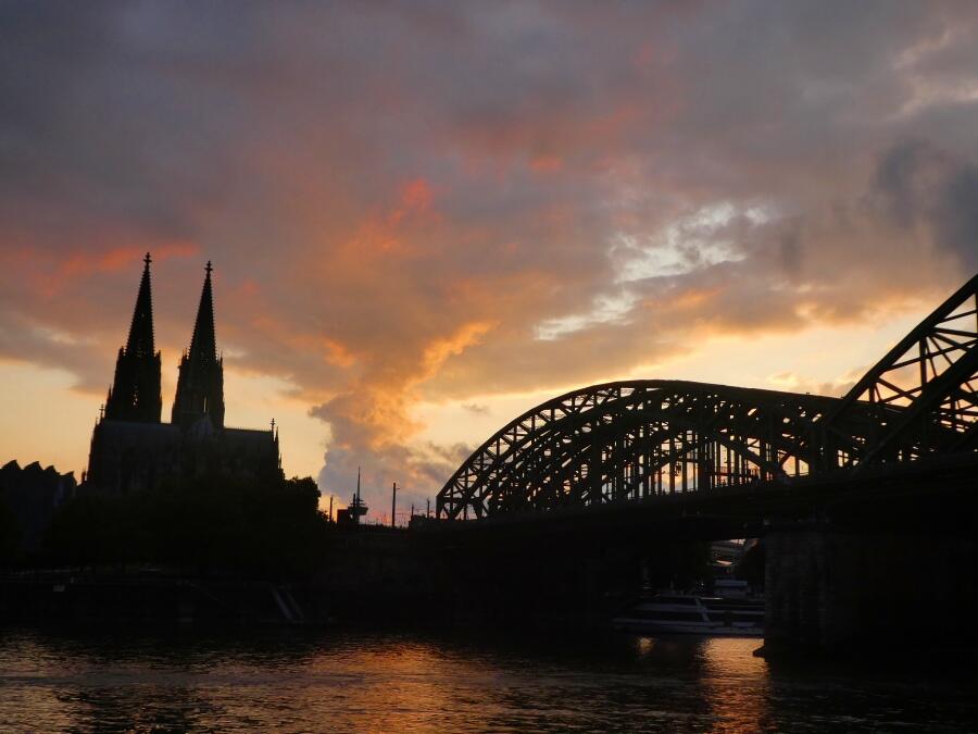 そうこうしているうち、いよいよ出港時間に。出発後は、客室内の窓から夕暮れ空のケルンの街を眺めて過ごしました。