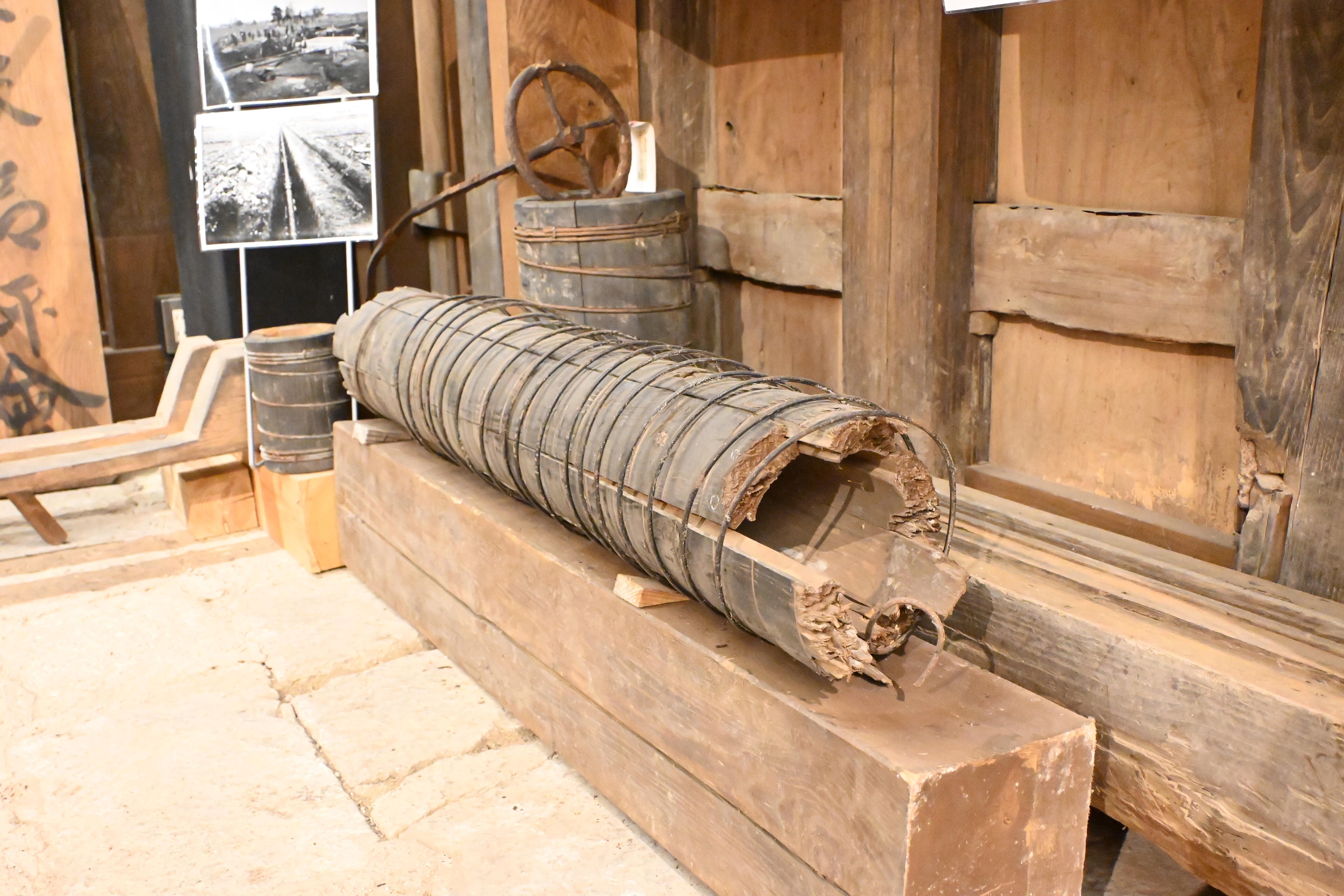 大正時代の水道工事で使用された木管も展示されており、これも池田家による地域貢献事業のひとつ。稲刈り後の冬季農閑期における雇用対策として実施されたもので、農家の人々の生活を支える配慮が込められていました。