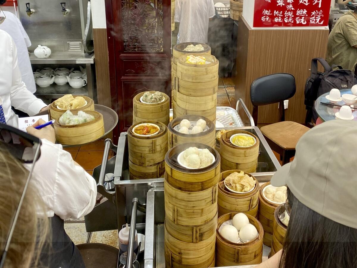 蓮香居で特徴的なのは、ワゴンにずらり並んだ点心。蒸し上がったばかりの点心が、立ちのぼる熱々の湯気とともに食欲をそそります。まず席に着いたら、最初に選ぶのはお茶の種類。ジャスミン茶や鉄観音茶など、日本人にも馴染みのあるお茶もあります。お茶はポットでテーブルに運ばれ、少なくなるとお湯を足してくれます。
