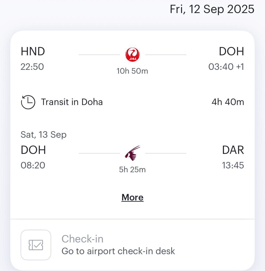 約11時間の快適なフライトでドーハに無事到着し、タンザニア行きの便にも大変スムーズに乗り換えることができました。JALの皆様の素晴らしいサービスに、改めて感謝の気持ちでいっぱいです。