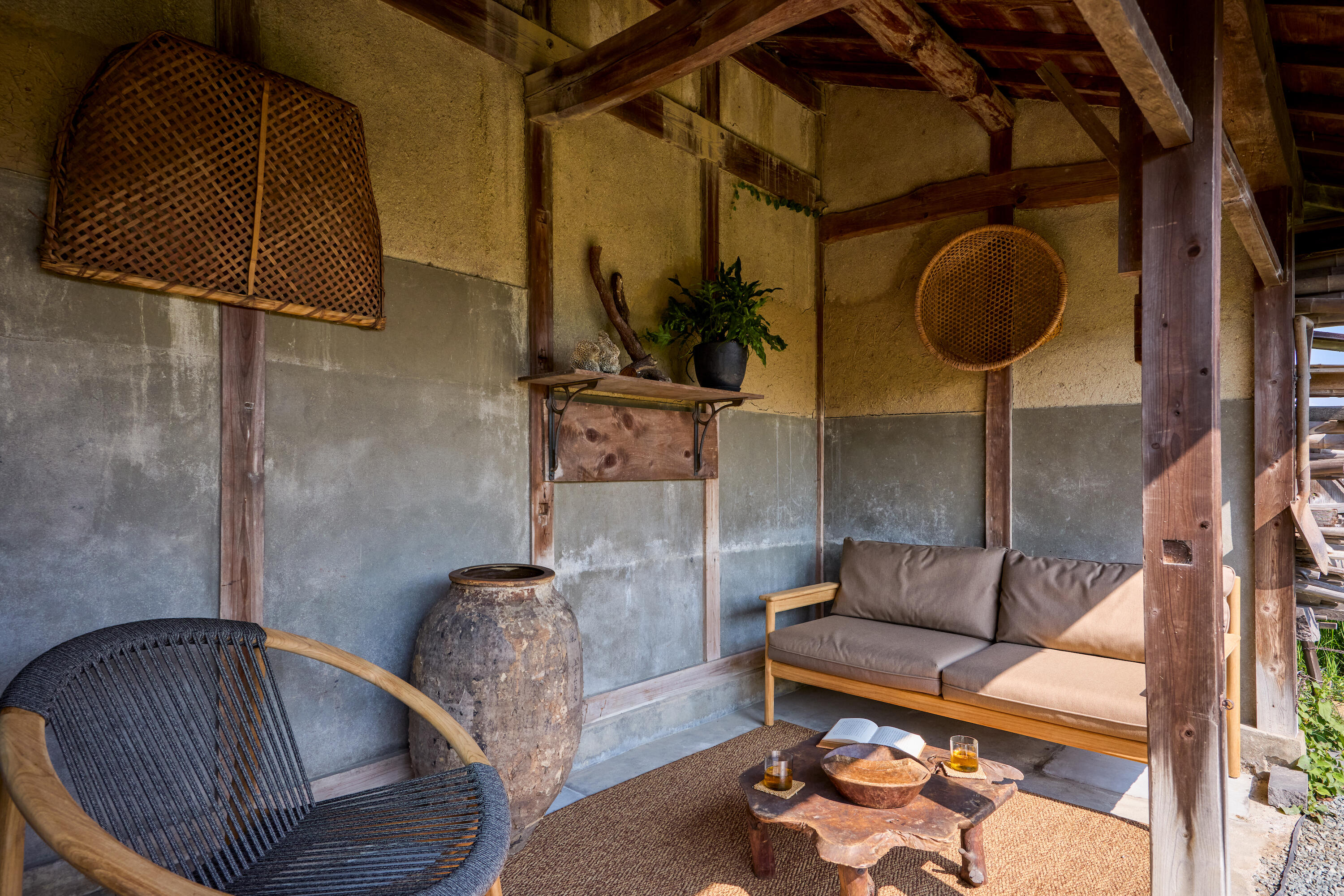 また室内だけでなくお庭や蔵の部分もローラさんのスタイリングが施されています。お庭にできたラウンジは、かつては山羊小屋として使われていたことも。自然の風を感じながら、ゆったりと読書やティータイムが楽しめる空間になっています。
