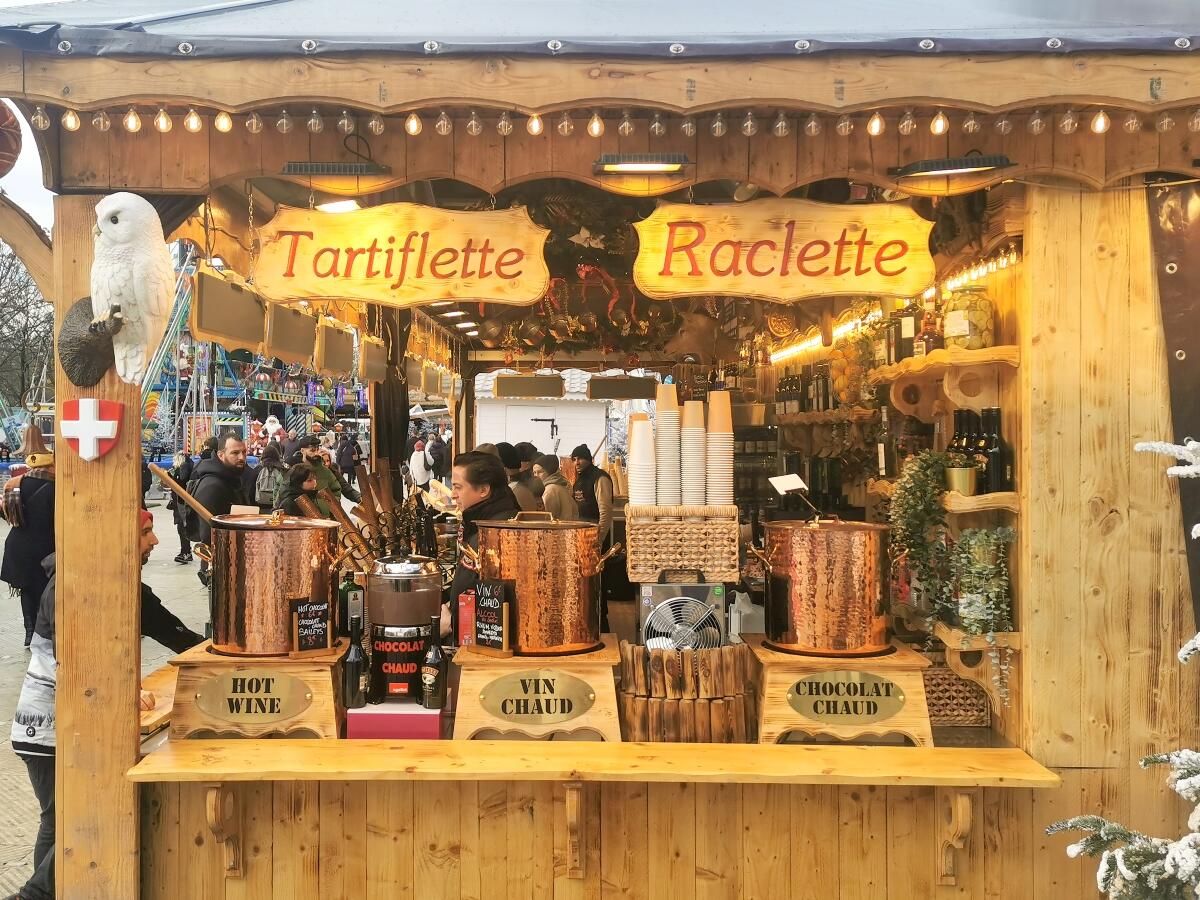 ラクレットサンドイッチはその名のとおり、ラクレットチーズを挟んだサンドイッチ。ラクレットサンドイッチの屋台では、大きなラクレットチーズが目の前で温められていて食欲をそそります。どれも温かい料理なので、冬にぴったりの食べ物ですよ。