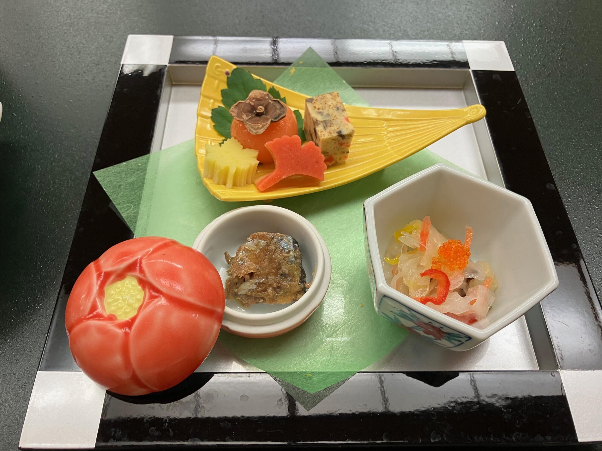 エリンギと蕪のマリネ、秋刀魚のみぞれ煮、栗チーズ紅葉、いちょう柿寄せ、木ノ子福草焼、もち柿