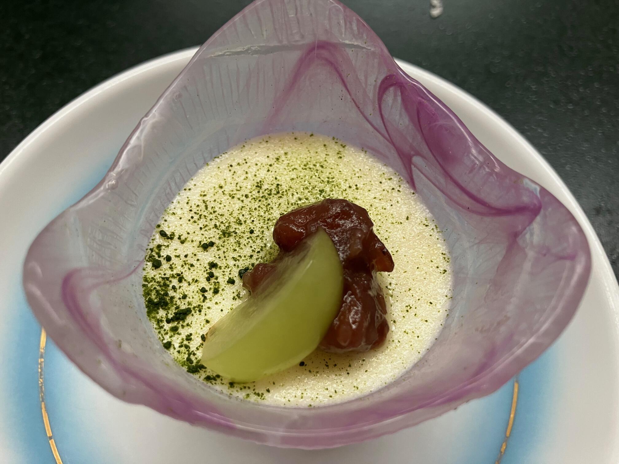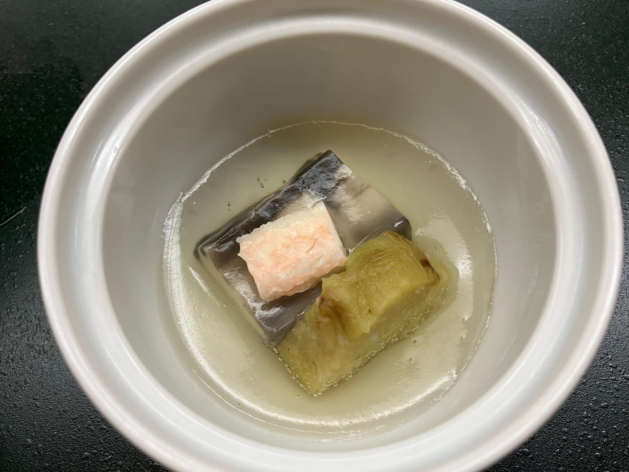 二色胡麻豆腐、焼き茄子、蟹棒肉、銀餡