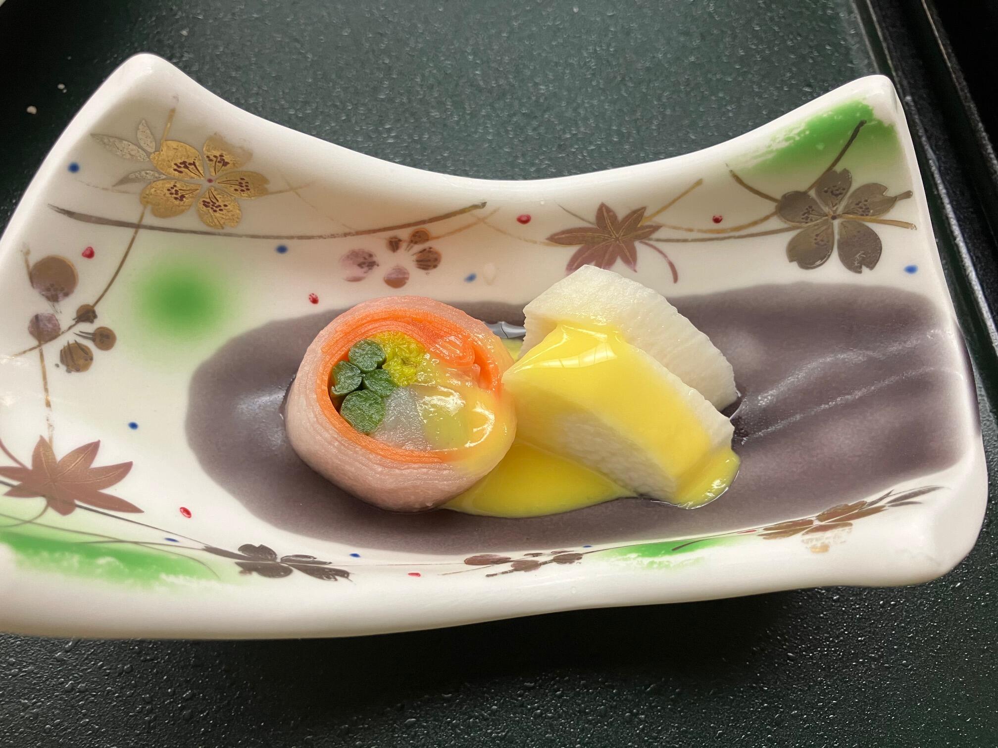 このしろ三色絹田巻、黄味酢ヨーグルト、長芋山葵漬け