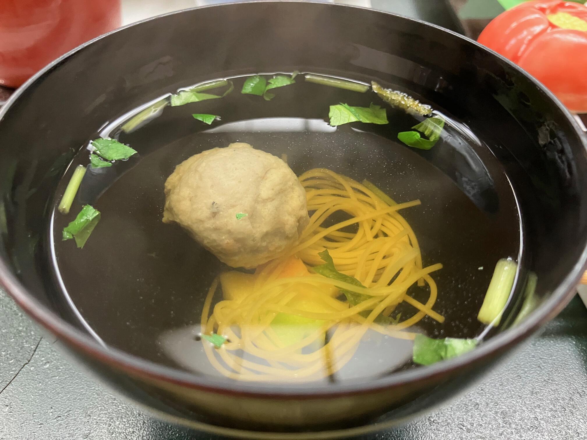 清汁仕立て(鰯つみれ、卵麺、紅葉かまぼこ、三つ葉、柚子)