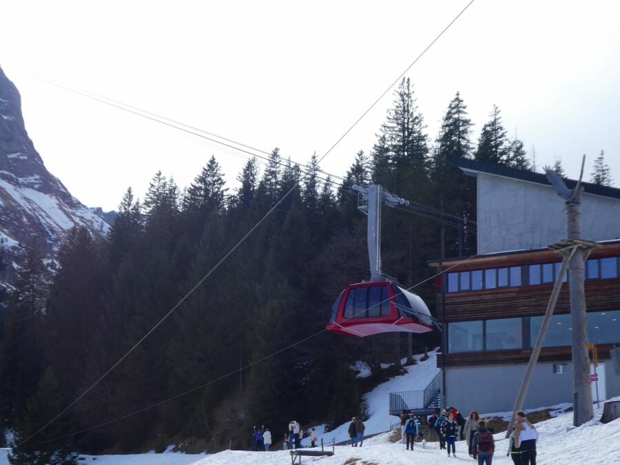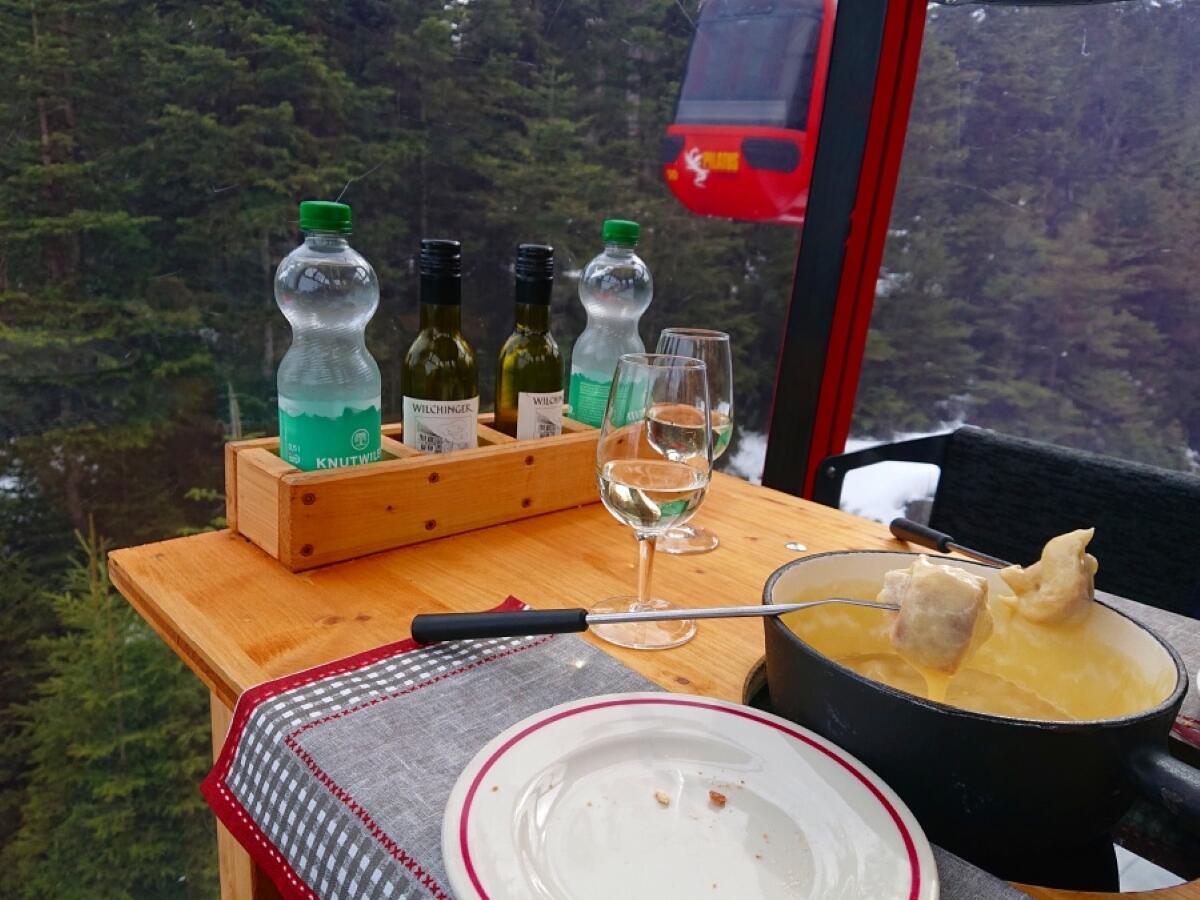 スイスでは、レストランやホテル敷地内に引退したロープウェイ用ゴンドラが設置され、そこでチーズフォンデュがいただける、といった場所は結構ありますが、実際に稼働しているゴンドラ内でのチーズフォンデュ体験は今回初めて。そのためどんな感じになるのか興味深々でした。