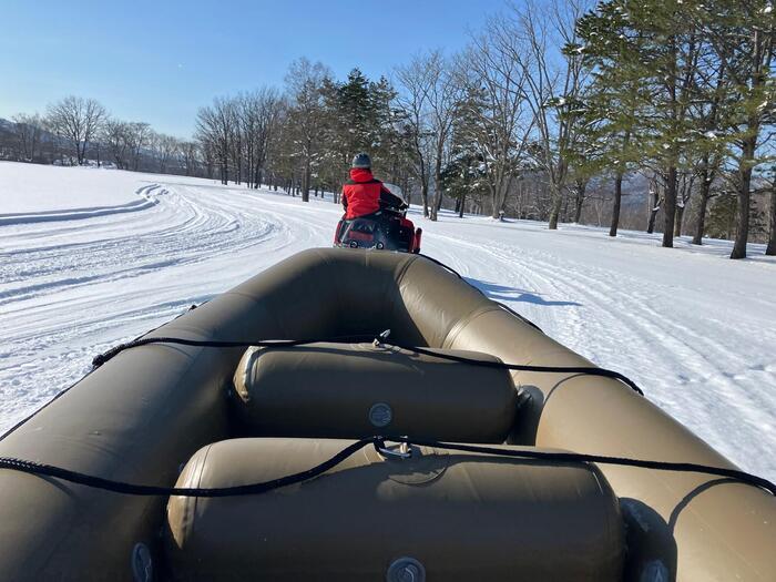 スノーモービルで引っ張ってもらうスノーラフティングは、お尻がブルンブルン振られてまるで遊園地の絶叫コースターのようです。