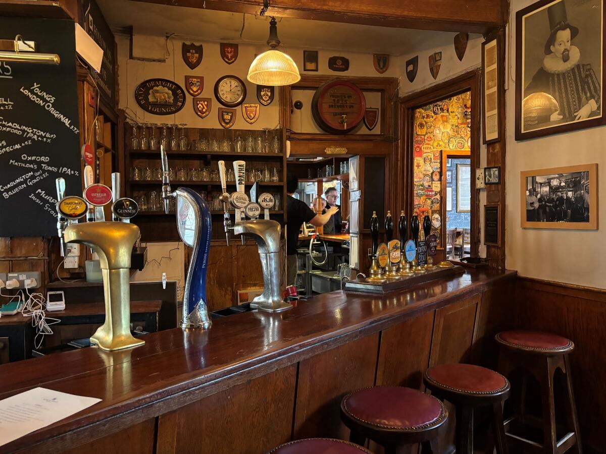 600年以上の歴史のあるパブなので、メインのカウンターはとても古く、天井も低く雰囲気があります。