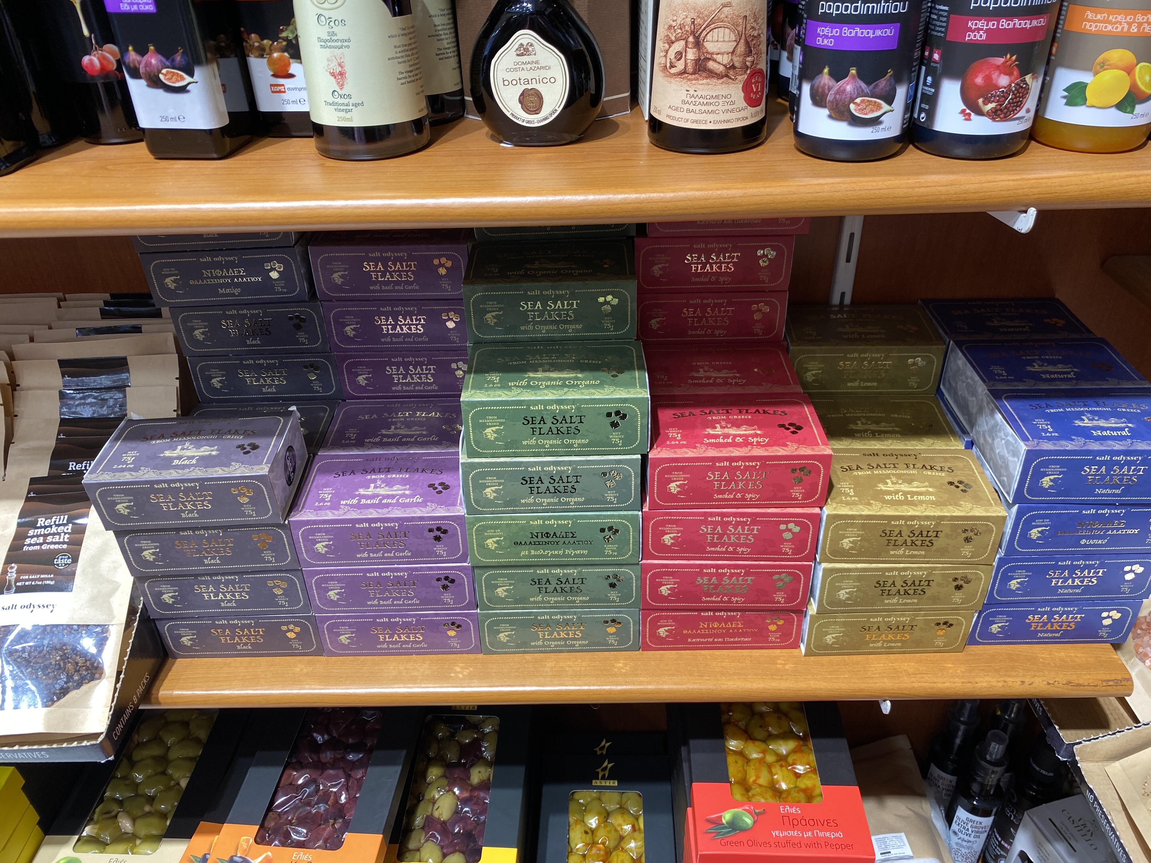 アテネ近郊のメソロンギなどで採れる海塩は、海の恵みやミネラル類がそのまま凝縮され、まろやかで旨みがたっぷり。