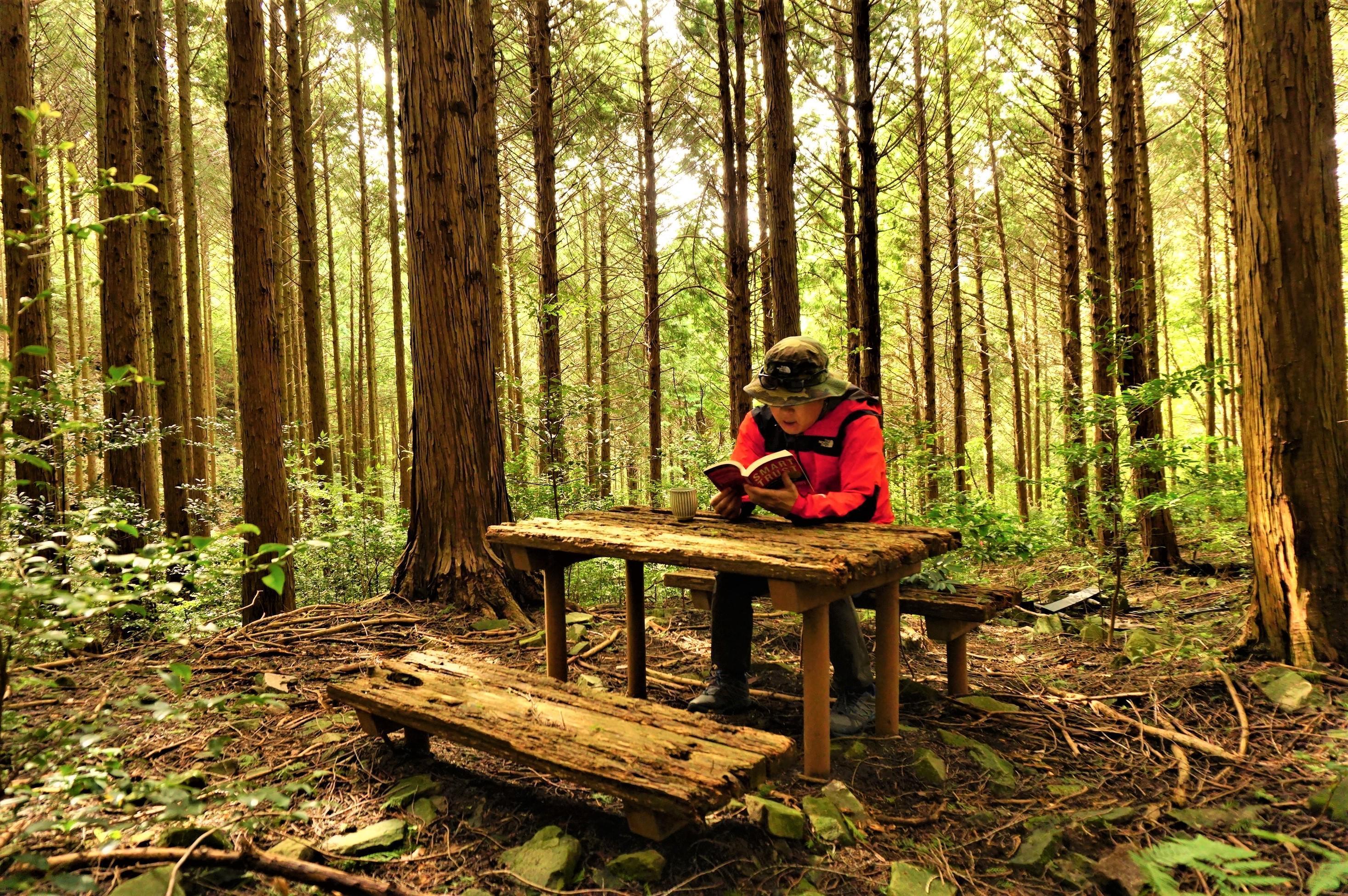進入登山道走約10分鐘後,將抵達滿佈檜木樹林區域。這裡涼爽宜人,空氣清新,與世隔絕能聽到的只有鳥兒的歌聲。這裡隨處都設有桌椅,非常適合閱讀。